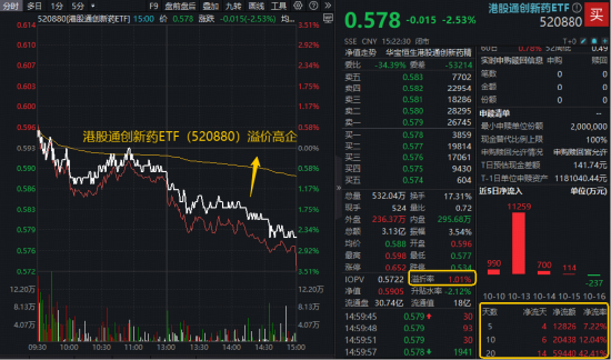 与A股医药核心标的一样,港股通创新药ETF(520880)全天溢价交易,且溢价幅度显著更大,溢价率一度飙升逾1%!近日该ETF资金面同样火热,近5日净流入逾1.28亿元。