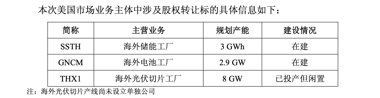 前文所述的供应美国的三家制造工厂,分别是已建成的海外光伏切片工厂THX1、建设中的海外储能工厂SSTH和海外电池工厂GNCM。