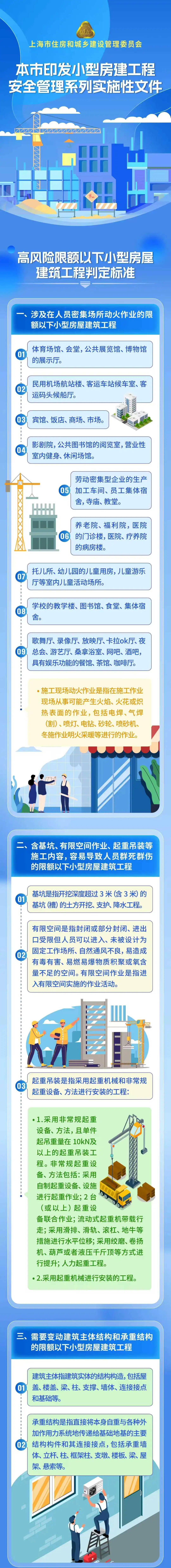 正文 一图读懂丨上海印发小型房建工程安全管理系列实施性文件 海信证券 V管理员 /2025-12-04 11:45:03/1阅读/0评论 1204 12月3日,上海市住房和城乡建设管理委员会微信公众号发布消息称,根据《上海市限额以下小型房屋建筑工程安全生产管理办法》(沪府办规〔2025〕12号)规定,市住房城乡建设管理委制定了《高风险限额以下小型房屋建筑工程判定标准》《业主、建设单位、施工单位管理职责清单和高风险限额以下小型房屋建筑工程管理要求》《街道办事处、乡镇人民政府巡查检查重点内容清单》等实施性文件,一起来看图解。